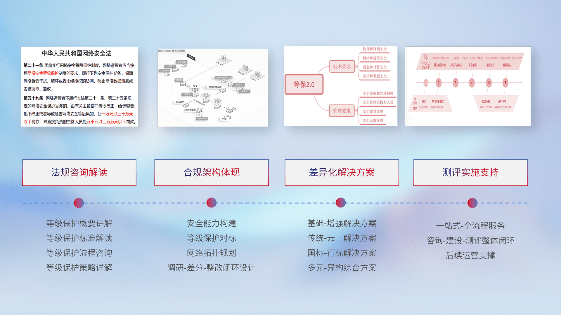 通过专业的法律咨询解读、、、、合规架构体现、、差异化解决方案、、、、测试实施支持等服务,,,,为客户量身打造等保合规体系。。。。